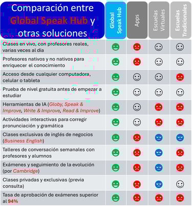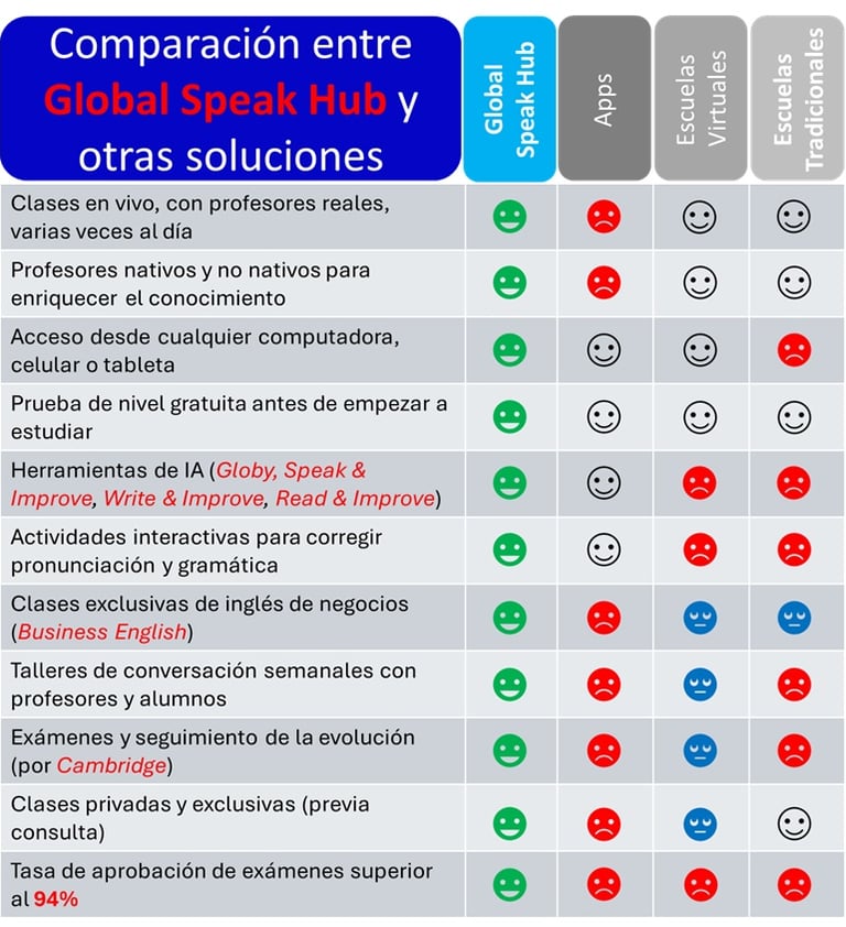 Global Speak Hub es una escuela de idiomas 100% online con un compromiso inquebrantable con sus estudiantes: garantizar que hablen inglés (y otros idiomas) con fluidez, sin miedo ni vergüenza. Utilizamos diversas herramientas de aprendizaje para cumplir con este compromiso, siempre y cuando el estudiante también esté dedicado a aprender y hablar.